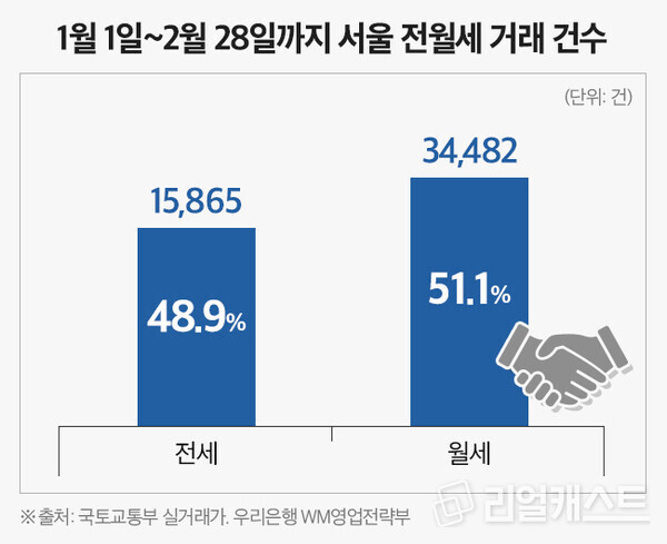 올해 1월 1일~2월 28일까지 서울 아파트 월세 거래는 총 1만 6,570건으로 전체 임대차 거래(3만 2,435건)의 51.1%를 차지했다. 반면 전세 거래는 1만 5,865건으로 48.9%를 차지했다(출처: 우리은행 WM영업전략부 국토교통부 실거래가 분석).