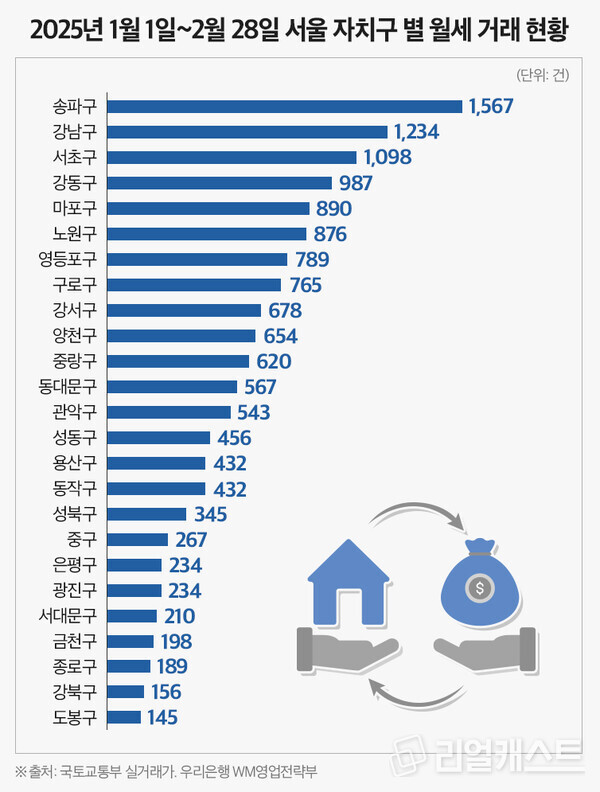 서울 자치구 가운데는 송파구가 해당 기간 가장 많은 1,567건으로 월세 거래가 있었으며 이어 강남구(1,234건), 서초구(1,098건) 등이 뒤를 이었다.