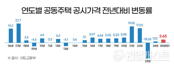 이번 ‘2025년도 공동주택 공시가격(안)’에 따르면 올해 전국 공동주택 공시가격은 지난해 변동률인 1.52%보다 2배 이상 높아진 3.65% 변동률을 기록했다. 공시 제도가 도입된 2005년 이후 연평균 변동률(4.4%)보다는 낮은 수준이다.