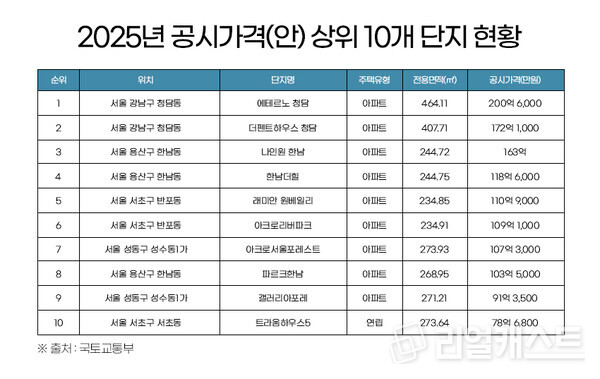 공시가격 상위 10곳은 모두 서울 위치하며 강남구 2곳, 용산구 3곳, 서초구 3곳, 성동구 2곳 등이 분포한다.