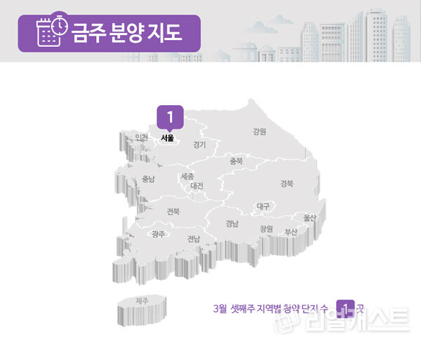 부동산인포에 따르면 3월 3주 전국에서 신규 청약 및 입주자를 모집하는 곳은 1곳, 총 104구로 집계됐습니다(총 가구 수 기준).
