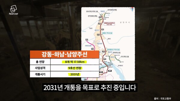 강동-하남-남양주선은 고덕강일1지구까지 올라온 9호선 4단계 연장을 받아서 진접2지구까지 늘리는 노선입니다. 총연장 17.59km 규모로 8개 역을 신설하는데, 이 가운데 미사와 다산(지금지구)이 있습니다. 2031년 개통을 목표로 추진 중입니다.