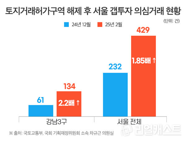 국회 기획재정위원회 소속의 조국혁신당 차규근 의원실이 국토교통부로부터 제출받은 자료를 기초로 올해 2월 주택 취득 자금 조달 및 입주계획서(자금조달 계획서)에 임대보증금을 승계 받고, 금융기관 대출을 끼고 있으며, 입주계획을 '임대'라고 써낸, 즉 갭투자로 의심되는 거래를 지난 12월과 비교한 결과 강남 3구에서는 2월 중 총 134건으로 확인됐다. 이는 지난 12월에 기록한 61건 보다 약 2.2배 증가한 수준이다.