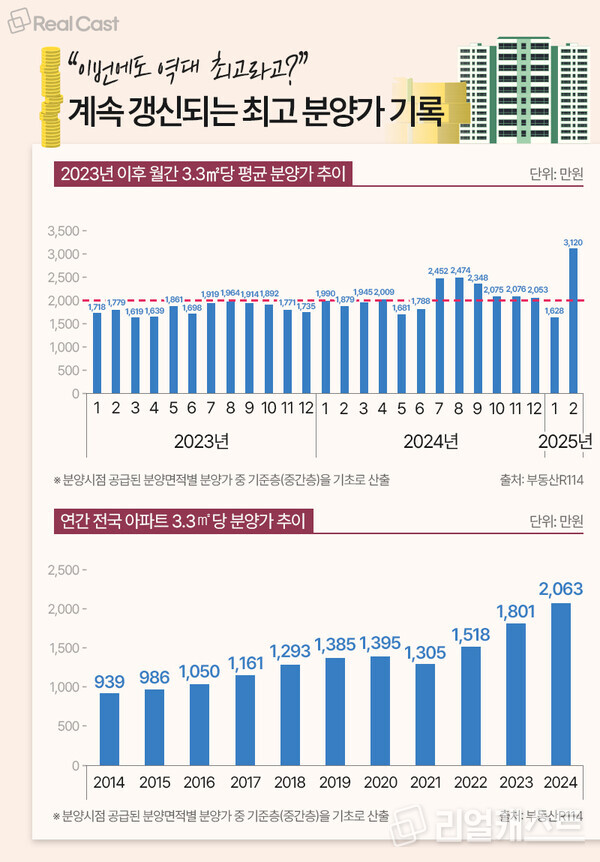 부동산R114에 따르면 2월 전국 분양 아파트 3.3㎡당 평균 분양가는 3,120만 원으로 월간 분양가 통계 기준, 역대 최고 수준이라고 합니다.
