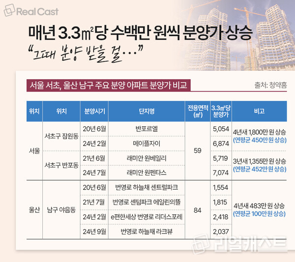 인근 반포동에서는 2021년 6월 래미안 원베일리 전용 59㎡가 3.3㎡당 5,719만 원에 분양했고, 3년 뒤인 2024년 7월에는 래미안 원펜타스 전용 59㎡가 이보다 1,355만 원 오른 7,074만 원에 분양을 했습니다. 서초구 분양 아파트들은 연평균 3.3㎡당 450만 원씩 분양가가 오른 셈입니다.