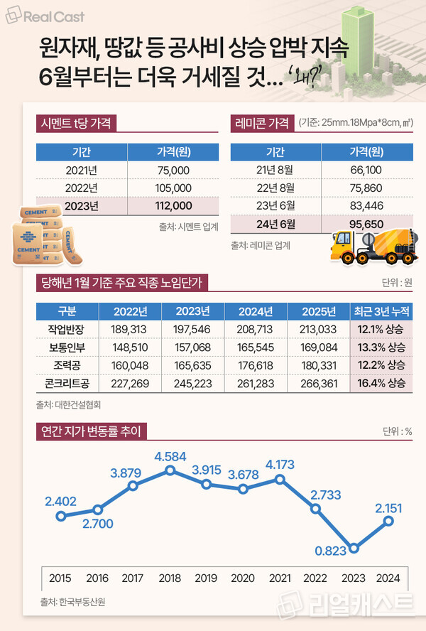관련 업계에 따르면 시멘트 가격은 2021년 t당 7만 5,000원에서 2023년에는 11만 2,000원으로 49.3% 상승했고 레미콘 가격은 2021년 8월 6만 6,100원(25mm. 18Mpa*8cm, ㎡ 기준)에서 2024년 6월에는 9만 5,950원으로 44.7% 상승했습니다. 건설 인부 노임도 매년 3~4% 안팎으로 상승하고 있습니다.