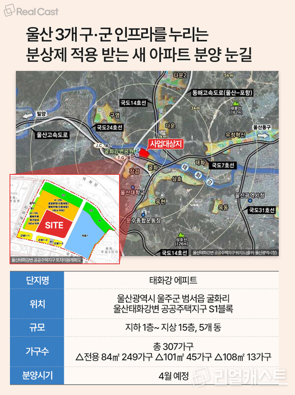 HL디앤아이한라가 울주군 굴화리 일원 태화강변 공공주택지구 S1블록에 짓는 ‘태화강 에피트’ 입니다. 단지는 지하 1층~ 지상 15층, 5개동, 전용면적 84~108㎡, 총 307가구 규모입니다.