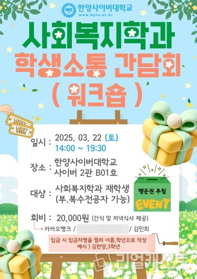 오는 3월 22일 토요일 오후 2시에 한양사이버대학교 사회복지학과 전체 학생이 모여, 단합과 열정이 함께하는 소통간담회 자리를 갖는다.