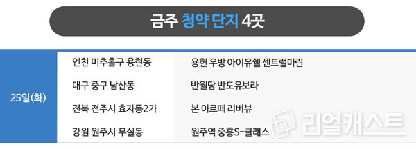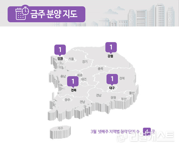 부동산인포에 따르면 3월 4주 전국에서 신규 청약 및 입주자를 모집하는 곳은 4곳, 총 1,184구로 집계됐습니다(총 가구 수 기준).