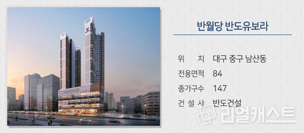 대구 중구 남산동에서는 반도건설이 '반월당 반도유보라'를 분양합니다. 지하 5층~지상 28·29층 2개동, 전용 84㎡ 총 147가구며 대구 1·2호선 환승역인 반월당역 20번 출구 바로 앞에 있는 역세권 단지입니다.