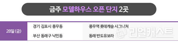 금주 모델하우스는 경기 김포와 부산 동래 등 2곳이 오픈 예정입니다.
