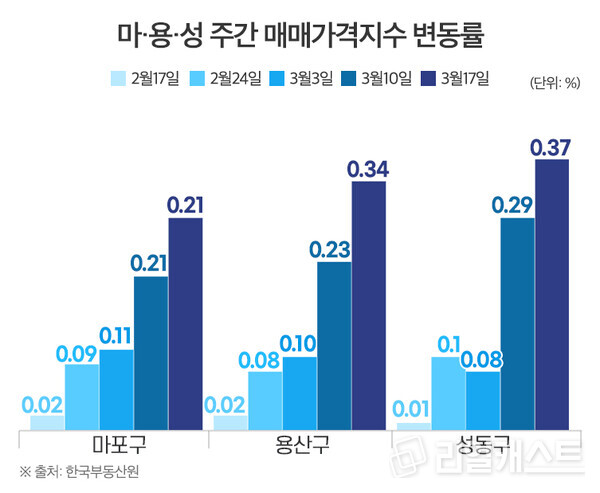 실제로 한국부동산원 주간 매매가격지수 변동률을 살펴보면 지난 한 달간 마·용·성에도 상당한 변화가 있었음을 확인할 수 있다.