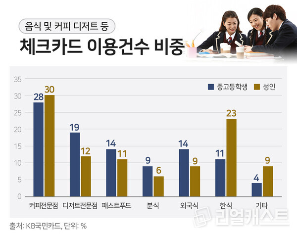 중·고등학생은 편의점을 가장 자주 이용하는 것으로 나타났습니다. 편의점(매점 포함. 이하 동일)은 체크카드 이용건수 비중이 25%로 가장 높았습니다. 이외에도 온라인쇼핑(13%), 음식점(12%), 커피·디저트(11%), 오락서비스(10%) 등 순으로 체크카드 사용빈도가 많은 것으로 확인됐습니다.