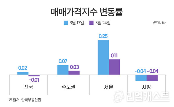 한국부동산원에 따르면 3월 4주(24일 기준) 주간 아파트 가격 동향에 따르면 전국 매매가격지수는 -0.01로 지난주 짧은 상승(0.02%)를 끝으로 다시 하락 전환됐다. 특히 서울은 0.11%로 전주 상승률의 절반 이하로 떨어져 전국 지수의 하락을 이끌었다.