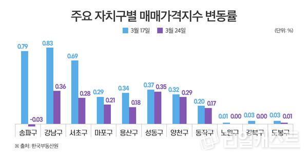 마포구는 0.29%에서 0.21%, 동작구는 0.20%에서 0.17%로 상승률이 소폭 낮아졌다.