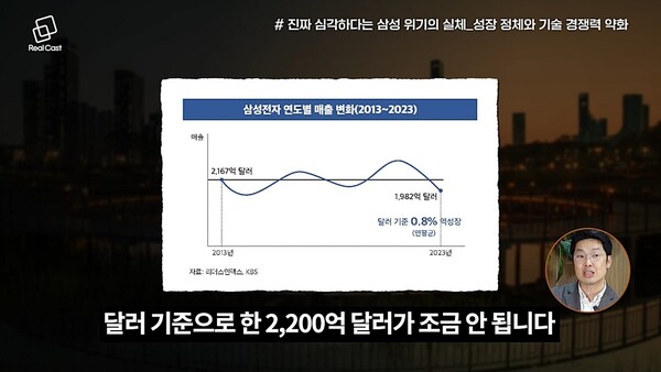 삼성전자는 지난 10년 동안 실질적인 성장을 이루지 못했습니다. 2013년 삼성의 매출은 약 2,200억 달러였으며, 2024년에도 거의 동일한 수준을 유지하고 있습니다. 이는 삼성전자가 지난 10년간 정체 상태에 머물러 있음을 보여주는 대표적인 지표입니다.