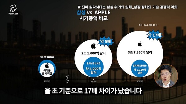 2013년 삼성전자는 애플과 비슷한 매출 규모를 유지했으나, 이후 애플은 지속적인 성장을 이어간 반면, 삼성전자는 정체 상태를 벗어나지 못하고 있습니다.