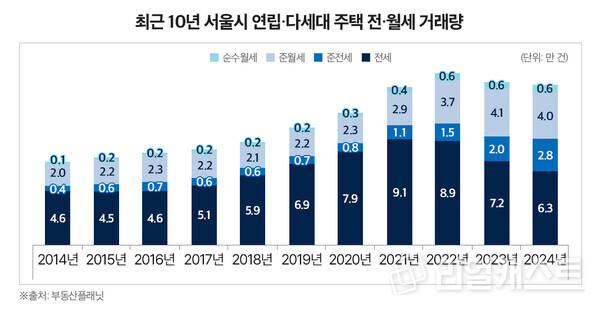 최근 10년 사이 서울시 연립·다세대주택 임대차 거래 추이를 보면 2021년 정점을 찍은 전세 거래는 3년 연속으로 감소하고 있다.