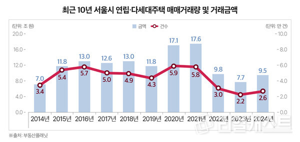 한편, 지난해 서울시 연립·다세대주택의 매매거래는 전년도보다 20.6% 늘어난 2만 6,214건으로 집계됐다. 거래 금액도 함께 증가해 약 9.5조(9조 4,711억 원)를 기록했다.