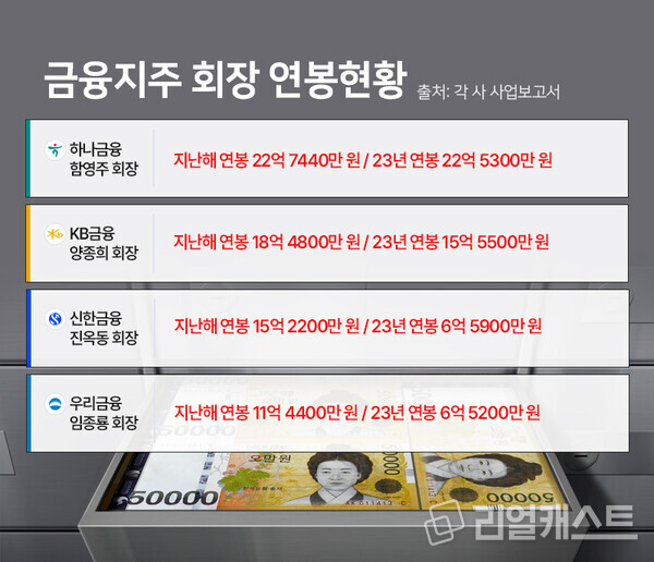 이는 23년(22억 5300만 원) 연봉과 비교해 2140만 원 더 늘어난 수치로 4대금융 회장 중에서는 가장 적은 상승률을 보였습니다.