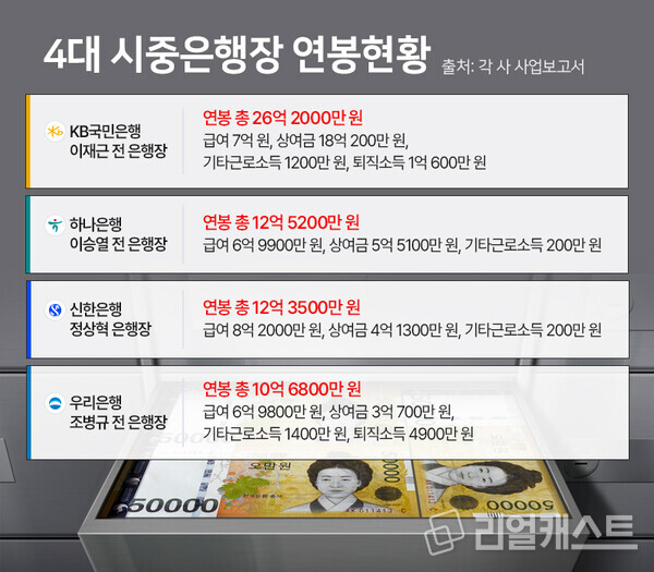 지난해 말로 임기를 마친 이재근 전 KB국민은행장이 시중 은행장 연봉 중 1위를 차지했습니다. 이재근 전 은행장은 지난해 급여 7억 원과 상여 18억 200만 원, 퇴직소득 1억 600만 원 등을 포함해 모두 26억 2000만 원을 받았습니다. 이는 KB금융 양종회 회장의 연봉인 18억 4000만 원 보다 7억 이상 많이 받은 것입니다.