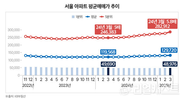 관련 통계에 따르면 5분위 아파트 평균 매매가격과 1분위 아파트 평균 매매가격이 5배 이상 벌어졌던 적은 2018년에도 몇 차례가 있었지만 5.8배까지 벌어진 적은 없었다. 지난 2024년 3월 5배로 벌어진 이후로는 5배 밑으로 떨어진 적이 없다.