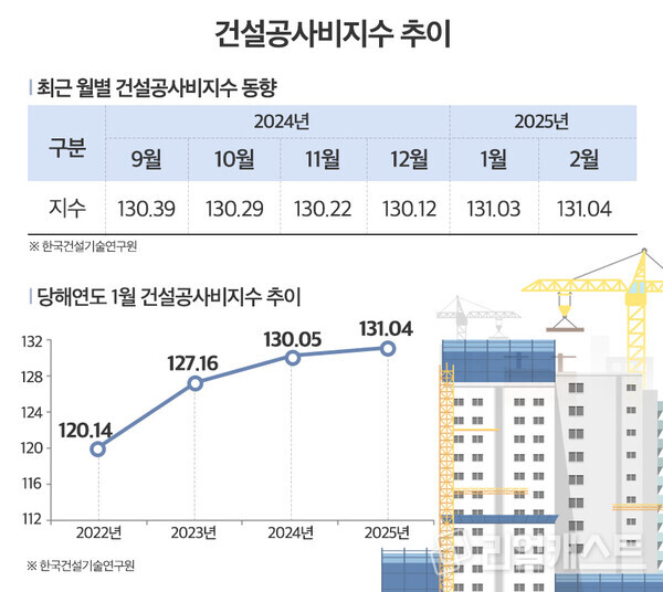한국건설기술연구원에 따르면 2월 건설공사비지수는 131.04로 2022년 120 수준이던 지수가 3년 만에 11포인트까지 상승했다.