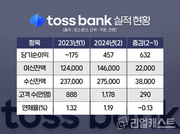 고객 수가 늘어남에 따라 수신도 성장세를 보였습니다. 24년 말 기준 수신잔액은 28조 5700억 원으로 전년 대비 9조 5000억 원(49.8%) 늘었으며 여신잔액은 16조 2700억 원으로 전년과 비교해 2조 4300억 원(17.5%) 증가한 것으로 확인됐습니다.