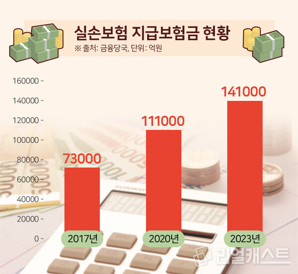 실제로 실손보험의 지급보험금은 지속적으로 확대됐습니다. 2017년 7조 3000억 원에 불과했던 지급보험금은 2020년 11조 1000억 원, 2023년 14조 1000억 원으로 6년 사이에 2배 가까이 증가한 것입니다.