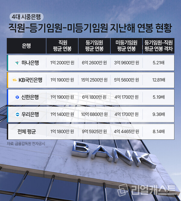 금융감독원 전자공시(DART)에 따르면 지난해 4대은행(KB·신한·하나·우리) 등기임원(사외이사·감사위원회 위원 제외)들의 평균 연봉은 1억 1800만 원으로 나타났습니다. 23년 기준 4대은행 직원의 평균 연봉은 1억 1600만 원이었습니다.