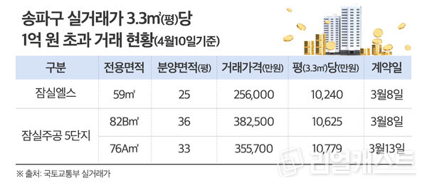 3월, 강남 3구 가운데 한 곳인 송파구 아파트 거래가에서 3.3㎡(평)당 1억 원 돌파 사례가 등장했다. 잠실지역에서는 첫 사례로 한 건도 아닌 3건이 연이어 나왔다.