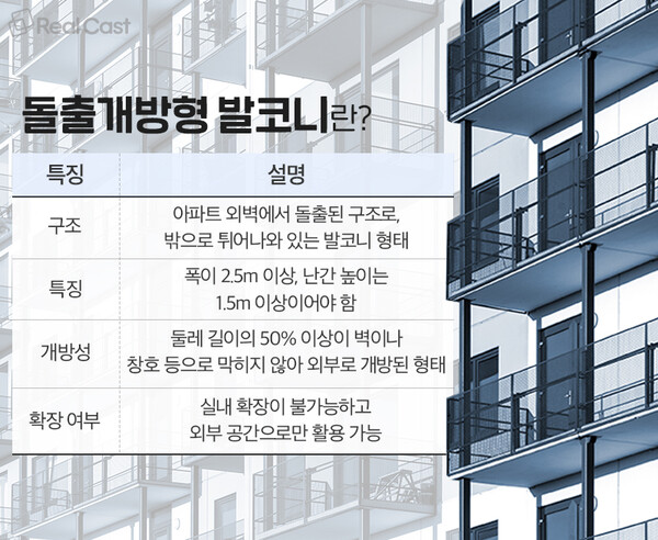 정확한 명칭은 ‘돌출개방형 발코니’입니다. 돌출개방형 발코니는 아파트 외벽에 돌출된 형태로, 돌출 폭이 2.5m 이상, 난간 유효높이는 1.5m 이상이어야 하며, 둘레 길이의 50% 이상이 벽이나 창호 등으로 막히지 않고 개방된 형태인 발코니를 뜻합니다.