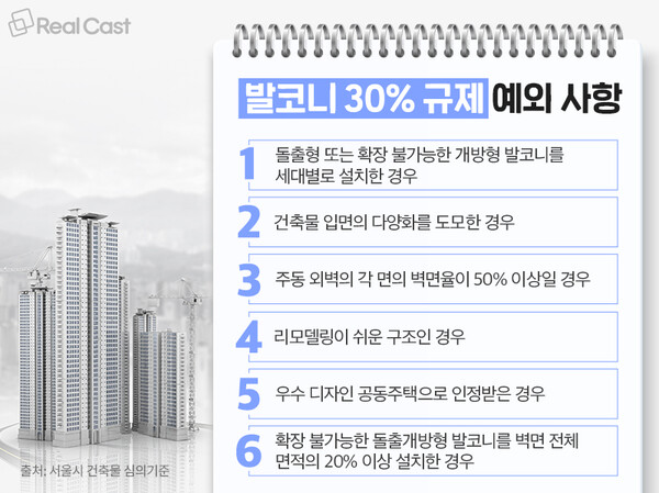 하지만, 실수요자 입장에서는 실면적이 줄어들 수 있어 부정적인 영향을 미칠 수 있는데요. 이에 대비 서울시는 발코니 삭제 규정에 예외 조항을 두어 돌출개방형 발코니, 입면 다양화, 우수 디자인 인증 등의 조건을 충족하는 경우, 삭제 비율을 낮출 수 있도록 허용했습니다.