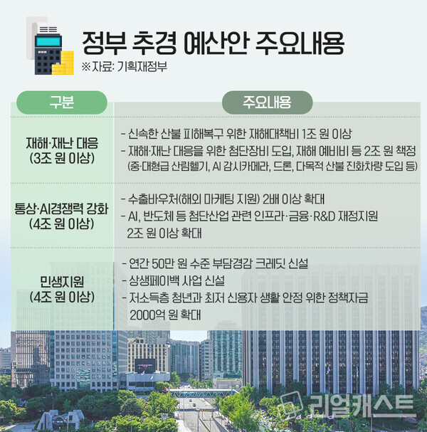 정부가 ‘추경’ 규모를 12조원대로 확정하고 다음 주 국회에 제출하기로 했습니다. 이는 기존에 계획한 10조 원에서 2조 원을 더한 규모로, 재해·재난 대응, 통상·AI경쟁력 강화, 민생지원에 중점을 둘 방침입니다.