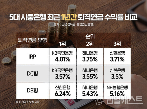 금융감독원 통합연금포털에 따르면 올해 1분기 말 기준 원리금비보장 기준 개인형 퇴직연금(IRP)의 최근 1년간 수익률은 KB국민은행이 4.01%를 기록하며 5대 시중은행 중 유일하게 4%대 수익률로 시중은행 중 1위 전체은행 및 증권사 중에서는 2위를 차지했습니다. 뒤를 이어 하나은행(은행장 이호성) 3.75%, 신한은행 3.71%, 우리은행(은행장 정진완) 3.24%, NH농협은행(은행장 강태영) 2.67%의 수익률을 거뒀습니다.