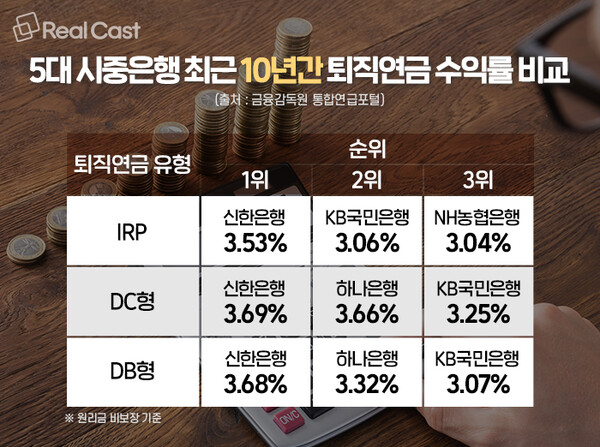 DC형 퇴직연금의 10년 수익률은 신한은행이 3.69%를 기록했으며 이어 하나은행 3.66%, KB국민은행 3.25% 순으로 확인됐습니다.