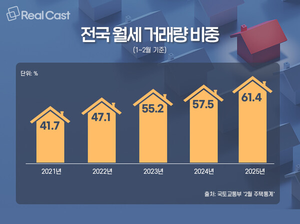 월세 비중은 점점 증가세를 나타내고 있는데요. 1~2월 기준으로 불과 4년 전인 2021년만 해도 41.7%였으나, 2022년 47.1%, 2023년 55.2%, 2024년 57.5%, 그리고 올해엔 드디어 60%를 넘어선 것입니다.