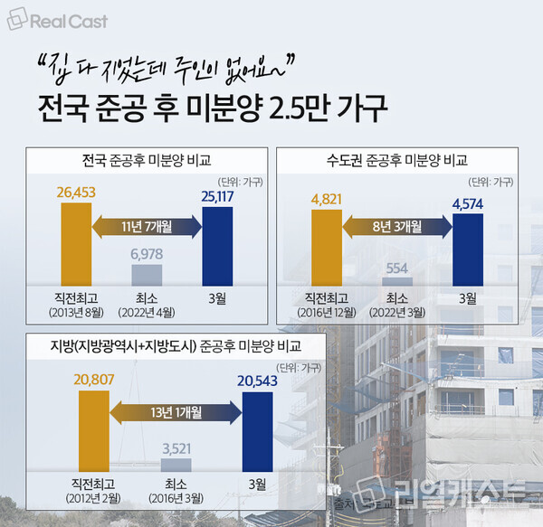 국토교통부가 발표한 ‘3월 주택 통계’에 따르면 준공 후 미분양은 2월(2만 3,722가구) 보다 1,395가구(약 5.9%) 증가했습니다.