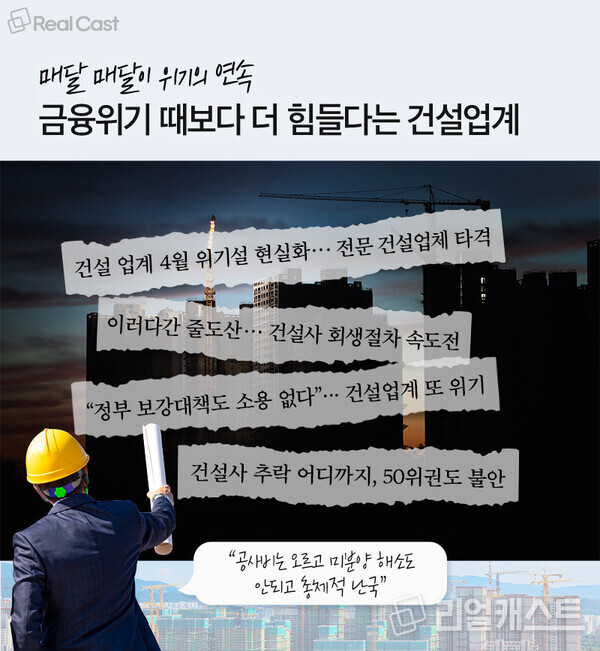 한 건설업 관계자는 “올해만 해도 3월 위기설, 4월 위기설에 이어 5월 위기설이 계속되고 있다. 공사비는 오르고 미분양 해소도 안되고 총체적 난국”이라고 말했습니다.