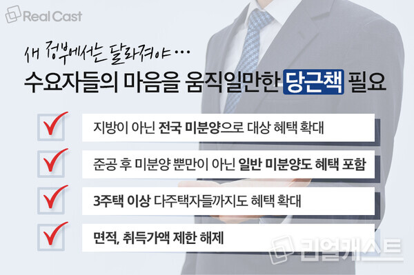 또한 준공 후 미분양 주택의 주택수 미포함 조건에 있어서 주택 구입자를 1~2주택 보유자로 한정하지 말고 구매력이 있는 3주택 이상의 다주택자들도 혜택 적용이 필요합니다.