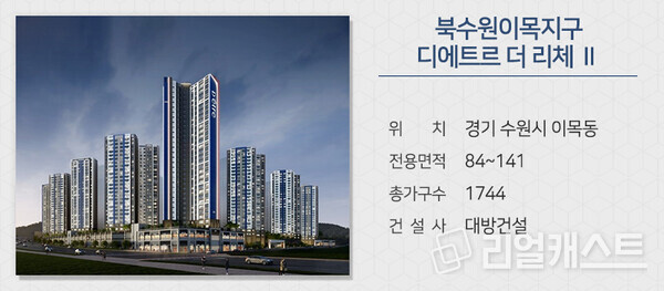 대방건설이 경기 수원시 이목동에 짓는 '북수원이목지구 디에트르 더 리체 Ⅱ'를 분양합니다. 앞서 공급된 1차 물량을 포함해 2,500여 가구의 대단지로 조성됩니다. 단지 내 실내수영장, 실내체육관, 사우나 등 차별화된 커뮤니티 시설이 조성될 예정입니다.