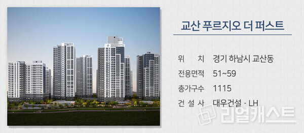 대우건설과 LH가 경기 하남시 하남교산지구에 짓는 '교산 푸르지오 더 퍼스트'를 분양합니다. 지하철 3호선과 5호선 하남건단산역 이용이 가능하고, 중부고속도로, 수도권 제1순환고속도로를 통해 차량 이동이 수월합니다.