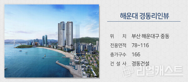 부산 해운대구 중동에서는 경동건설이 '해운대 경동리인뷰'를 분양합니다. 부산도시철도 2호선 해운대역을 비롯해 해운대 해수욕장 등이 모두 도보권입니다. 해운대 초·중·고·여중·여고 등 학군과 인제대 백병원, 홈플러스 등의 인프라도 우수합니다.