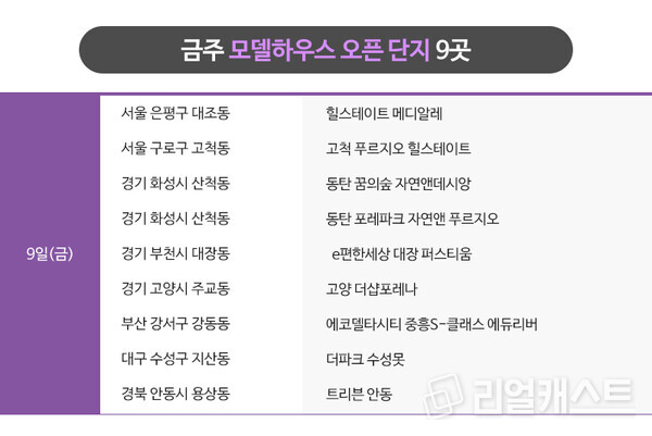 오랜만에 총 9개 단지의 모델하우스가 오픈합니다. 권역별로 수도권 6곳, 지방 3곳 등입니다.