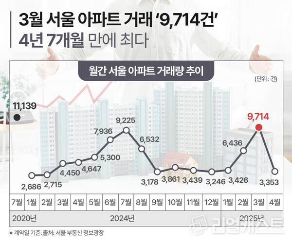 서울 부동산 정보광장에 따르면 3월 서울 아파트 거래량은 총 9,714건으로 2020년 7월 기록했던 1만 1,139건에 이어 가장 많은 거래건수에 해당합니다.