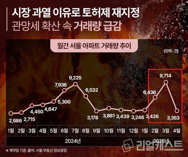 해제 한 달 만에 토허제가 재지정되면서 수요자들은 상당한 충격을 받은 모습니다. 4월 서울 아파트 거래량은 3,353건으로 3월 대비 65.5%, 전년 동기 대비해서도 27.8%가 감소했기 때문입니다.