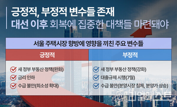현재 서울 부동산시장은 회복에 영향을 끼칠 만한 긍정적인 요소와 부정적인 요소가 공존하고 있습니다.