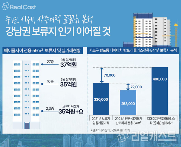 부동산인포 권일 리서치팀장은 “충분한 현금을 보유한 경우라면 보류지는 상당히 매력 있는 투자처로 볼 수 있습니다. 특히 규제를 적용받지 않는 보류지의 특성상 서울 강남권 등의 정비사업 보류지는 당분간 큰 인기를 누릴 것”이라고 말했습니다.