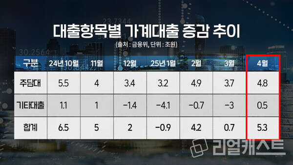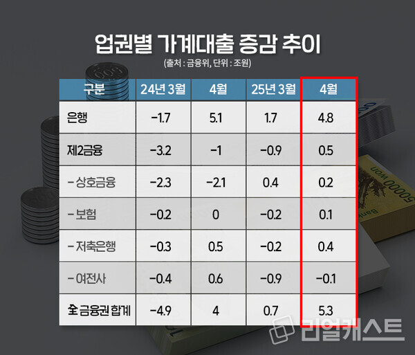 금융위원회(이하 금융위)가 14일 발표한 '2025년 4월중 가계대출 동향(잠정)'에 따르면 지난달 전 금융권 가계대출은 총 5조 3000억 원 증가한 것으로 나타났습니다. 특히 3월(7000억 원) 대비 증가폭이 크게 확대됐는데 주택담보대출이 크게 늘어난 여파입니다.