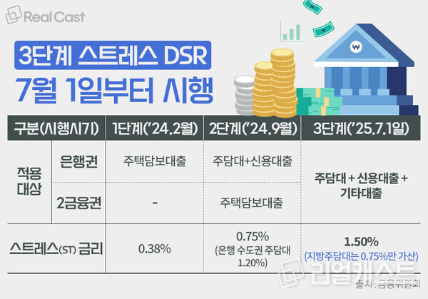 금융위원회가 5월 20일 실시한 ‘가계부채 점검회의’를 통해 3단계 스트레스 DSR을 당초 예정대로 7월 1일 시행하기로 했습니다. 지난해 2단계 시행(2024년 9월)에 이어 올해 7월 3단계 시행을 예고한 그대로 시행이 되는 것입니다.